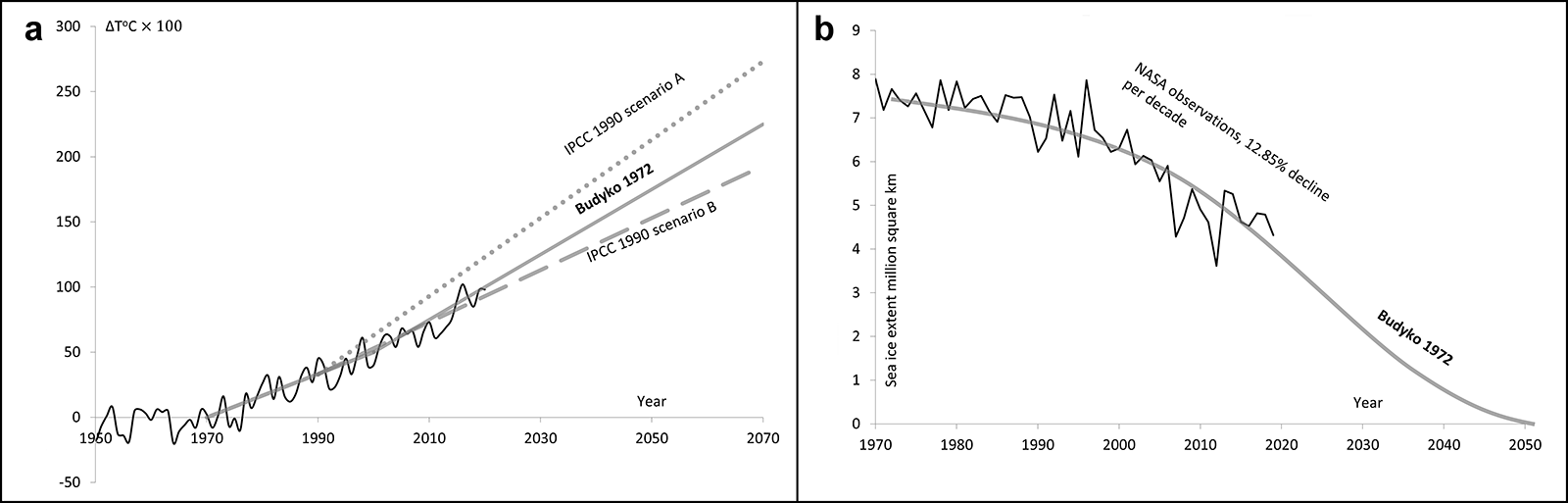 Since 1972, the burning of fossil fuels has released over two trillion tons of carbon dioxide into the Earth’s atmosphere. This is trapping more heat, and temperatures on land, air and sea surface are rising. In important respects this is entirely unsurprising. 1972 was an important year not just for spaceflight but climate science because 1972 was when Soviet climate scientist Mikhail Ivanovich Budyko produced a prediction of climate change for the next 100 years. It has proved to be remarkably prescient. Comparing 2020 to 1970, Budyko predicted an increase in the global mean temperature of around 1°C and a halving of Arctic multiyear sea ice. You can see just how accurate he was.